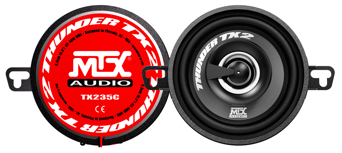The MTX TX235C (8,5cm 3.5" 2-way coaxial 40W RMS 275W Peak) speakers shine with their sound quality, very high power handling, great design and exceptional finish. It is advisable to use the TX235C with a small amplified subwoofer such as the MTX RTU8P, RTT8P, RTP8 or RTF10P to reinforce the low frequencies.