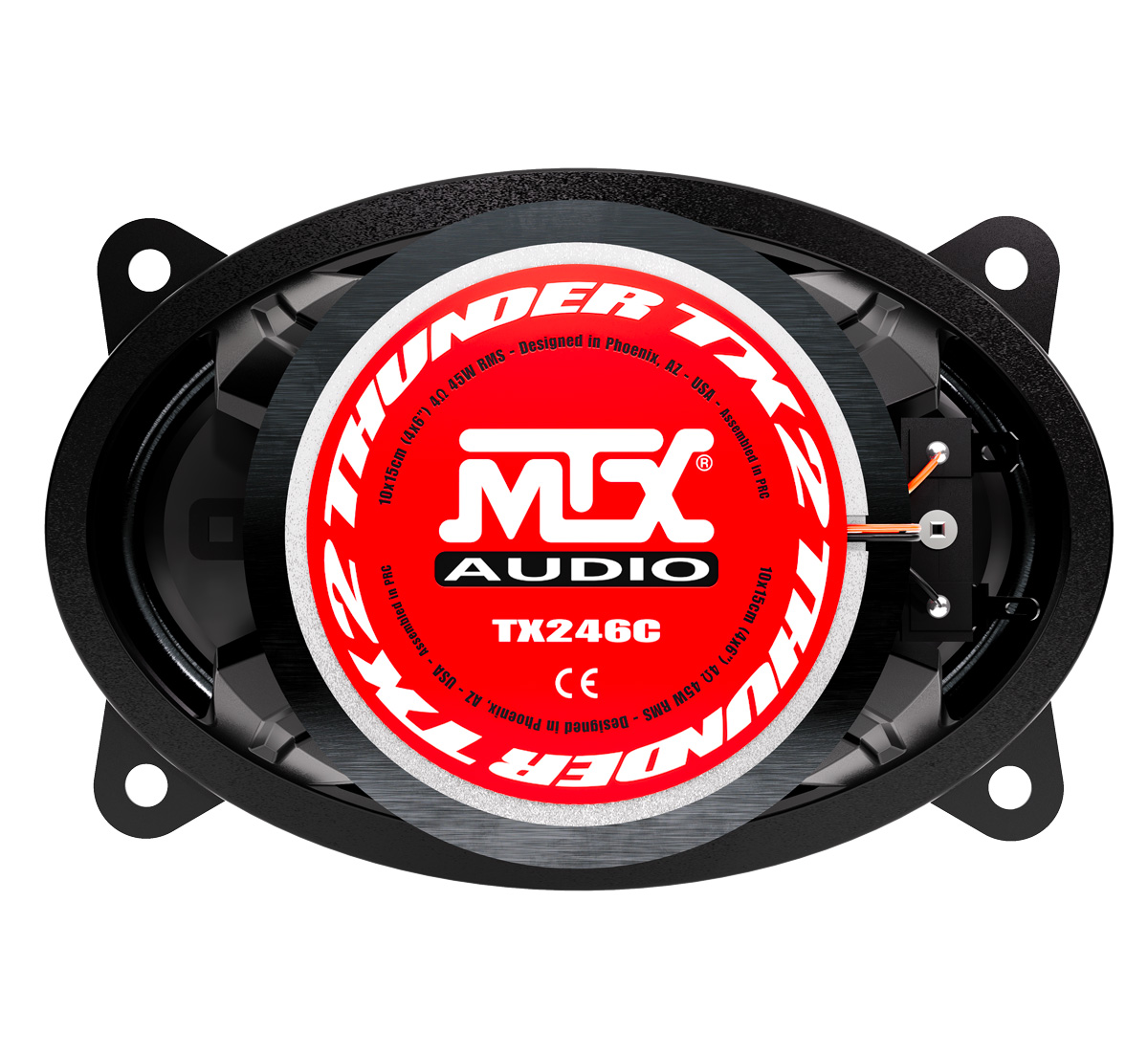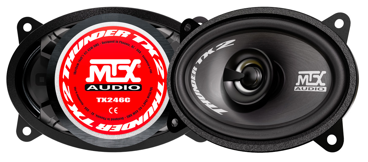 The MTX TX246C (10x15cm 4x6" 2-way coaxial 45W RMS 310W Peak) speakers shine with their sound quality, very high power handling, great design and exceptional finish. It is advisable to use the TX246C with a small amplified subwoofer such as the MTX RTU8P, RTT8P, RTP8 or RTF10P to reinforce the low frequencies.